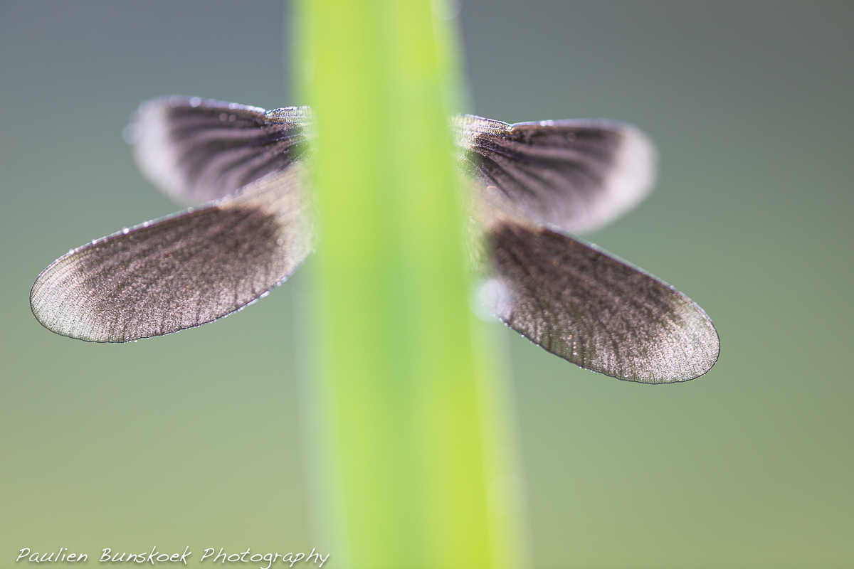 Vroeg in de ochtend zitten ze nog stil in de begroeiing van traag stromende beken. Daar kun je ze soms in grote getale vinden. Vaak zitten ze met de vleugels gesloten, zoals andere juffers, maar soms zitten ze met de vleugels open. In dit geval wilde ik alleen de vleugels op de foto die zo mooi uitstaken naast het riet waarachter de juffer zat. Ik vond de donkerblauwe randjes van de vleugels heel fraai dus ik heb gezorgd dat die scherp waren. Op de vleugels zitten nog duizenden minuscule dauwdruppeltjes die net wat glinstering geven.