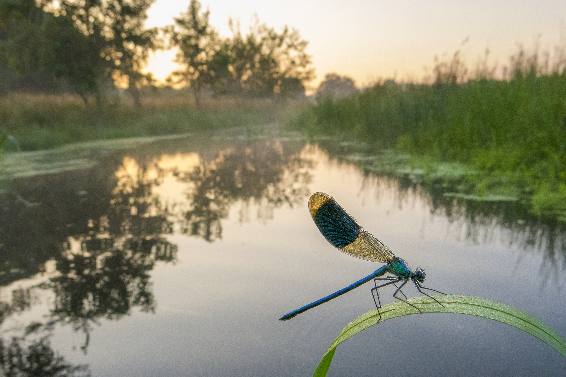 Als je in de vroege ochtend op pad gaat om libellen en juffers te fotograferen heb je alle tijd – zodra je een exemplaar hebt gevonden – om deze vanuit allerlei hoeken te fotograferen. Ze zijn dan namelijk nog niet opgewarmd en blijven rustig zitten. Heb je als achtergrond ook een mooi landschap, dan is het leuk om het macro-objectief te vervangen voor een groothoekobjectief.