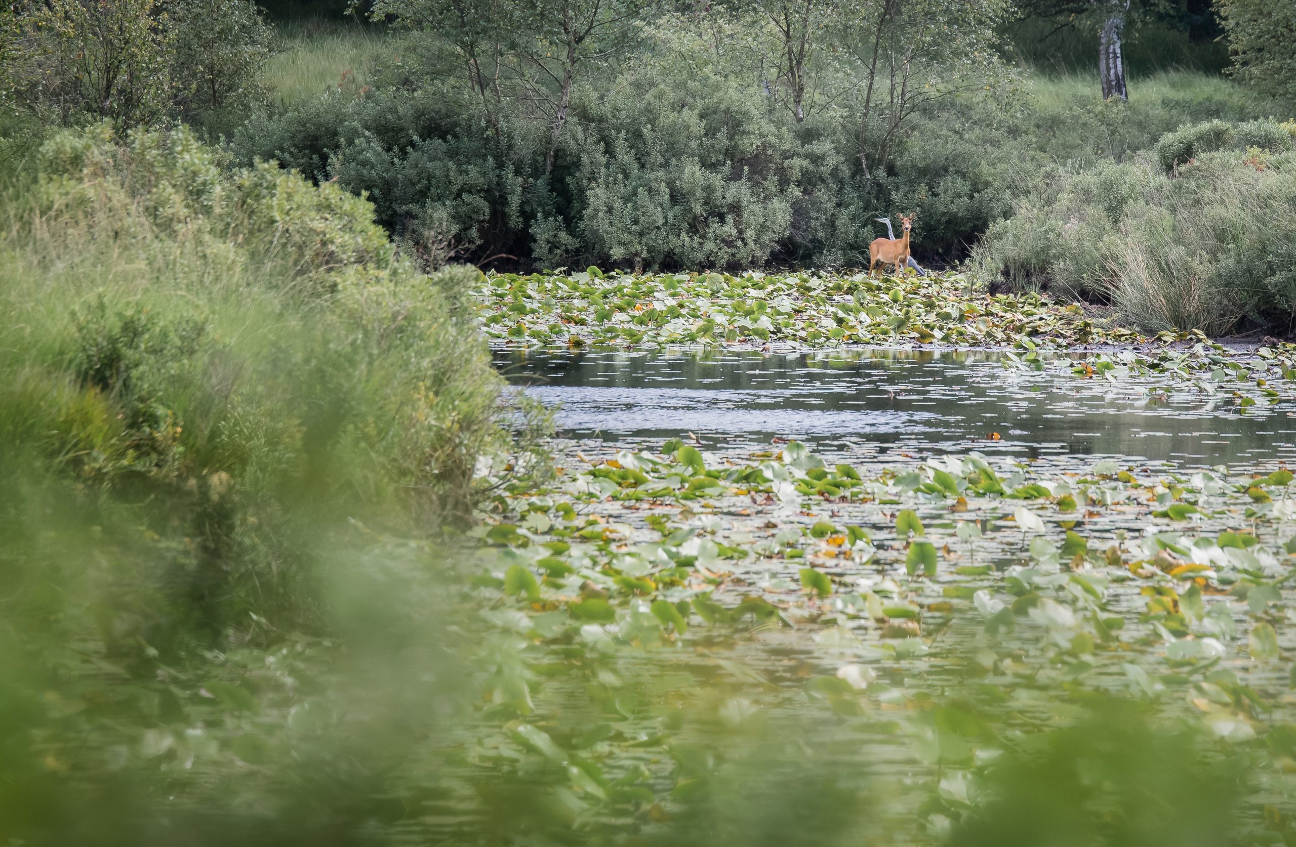 Dat dit meertje in de omgeving één van de weinige waterbronnen is, was te merken aan het feit dat er midden op de dag een ree uit de varens tevoorschijn kwam om lekker af te koelen. Zonder zich aan anderen te storen, liep dit beestje het water in. Dat er een reiger vlakbij stond, maakte allemaal niets uit. Samen delen, want iedereen heeft het zwaar!