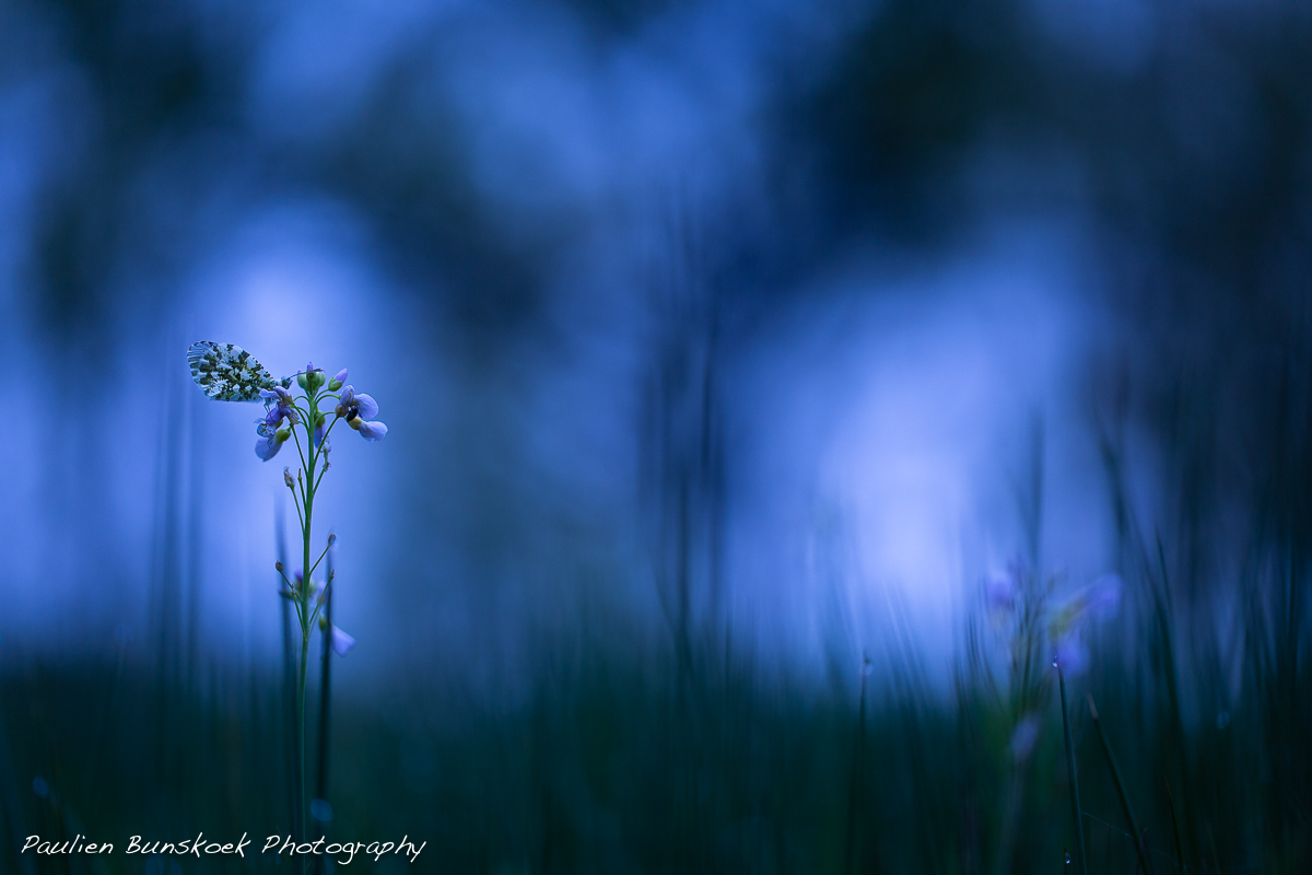 Het voorjaar is inmiddels losgebarsten en daarmee zijn er ook enorm veel fotografische onderwerpen wakker geworden. En menig natuurfotograaf moet daarvoor dan weer vroeg opstaan. Ik heb me ook weer vol overgave op de bloemetjes en de beestjes gestort. Vooral vlinders trekken me erg en ik heb dit jaar gelukkig wat mooie plekjes met oranjetipjes gevonden. De weersvoorspellingen waren deze week erg onduidelijk, mist of geen mist, wel of geen zon, regen of toch niet en het eindigde helaas vaak in saaie grijze ochtenden. Lastig voor een natuurfotograaf, moet ik nou wel of niet die wekker zetten? Om te laten zien dat je dan niet helemaal voor niks om 4 uur bent opgestaan heb ik deze foto uitgekozen. Een oranjetipje in de vroege schemer.