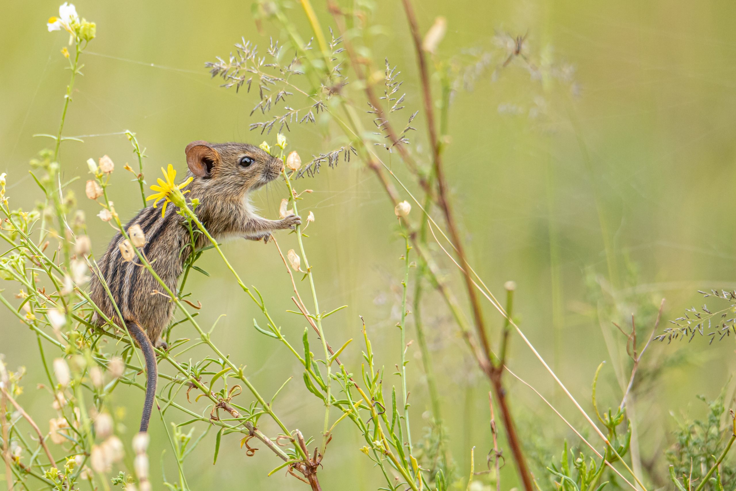 “Op de foto zie je een gestreepte grasmuis in zijn natuurlijke habitat in Zuid Afrika. De soort kun je in verschillende variaties tegenkomen in Afrika, ze krijgen 5 tot 6 jongen die geboren worden in de zomer in een holletje onder de grond. Ze eten voornamelijk zaden maar ook insecten. Als ze aangevallen worden door een roofdier dan houden ze zich dood of ontkomen door hun staarthuid af te werpen. “