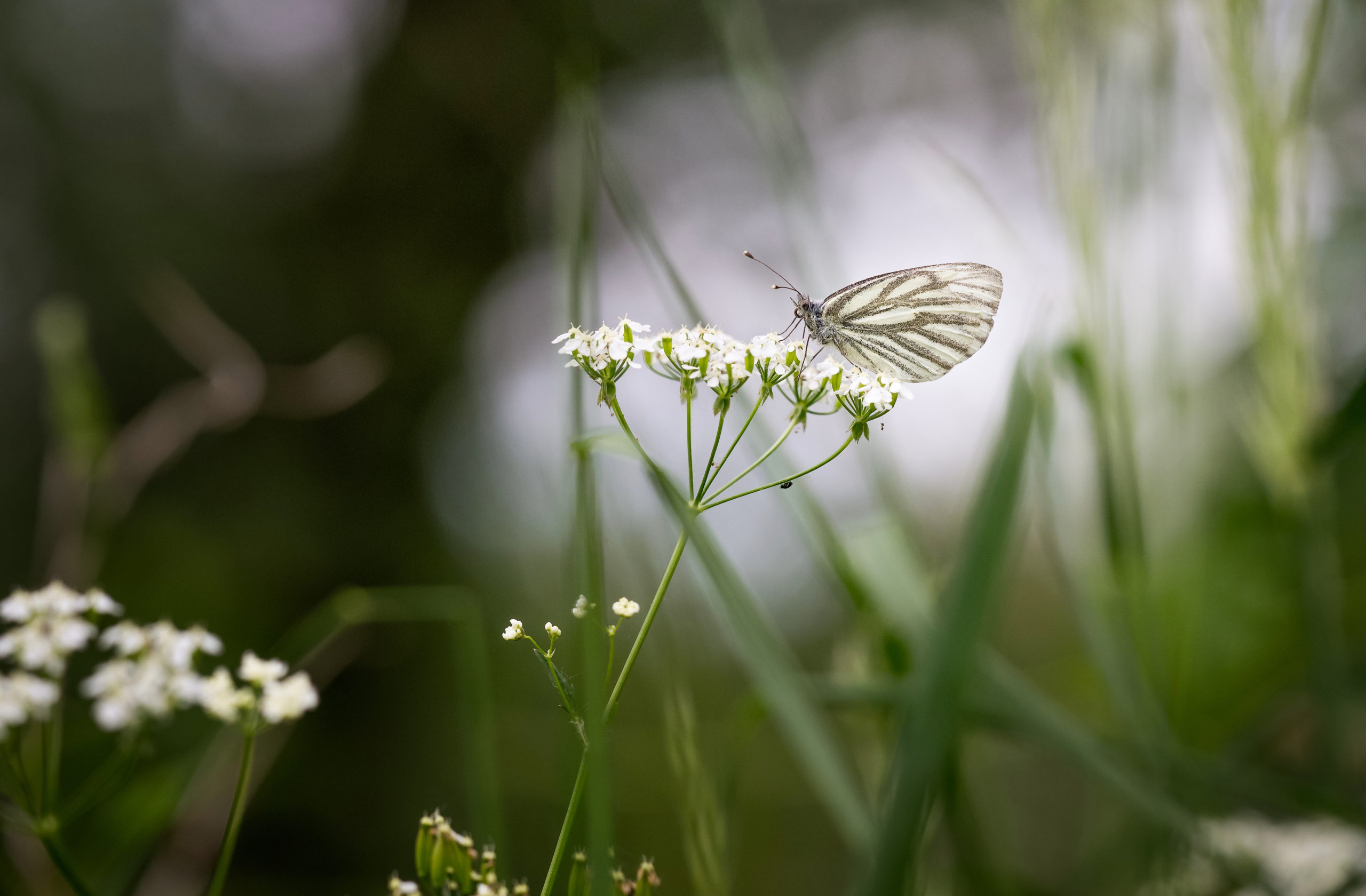 Dat is mijn kans. Ik wacht totdat de vlinder in mijn buurt gaat zitten, langzaam sluip ik dichterbij en zie dat het een geaderd witje is. Hoe deze vlinder aan zijn naam komt, valt goed op te maken uit de foto. Vlinders zitten vaak alleen maar stil in de vroege ochtend. Maar deze vinder blijft rustig zitten (ondanks dat het al bijna middag is) en geeft mij de kans om verschillende foto’s te maken vanuit verschillende hoeken. Uiteindelijk heb ik ervoor gekozen om de vlinder niet als portret neer te zetten, maar als onderdeel van een mini-landschap. Door gebruik te maken van het licht dat op de achtergrond door de bomen schijnt, krijgt het onderwerp voldoende aandacht.”