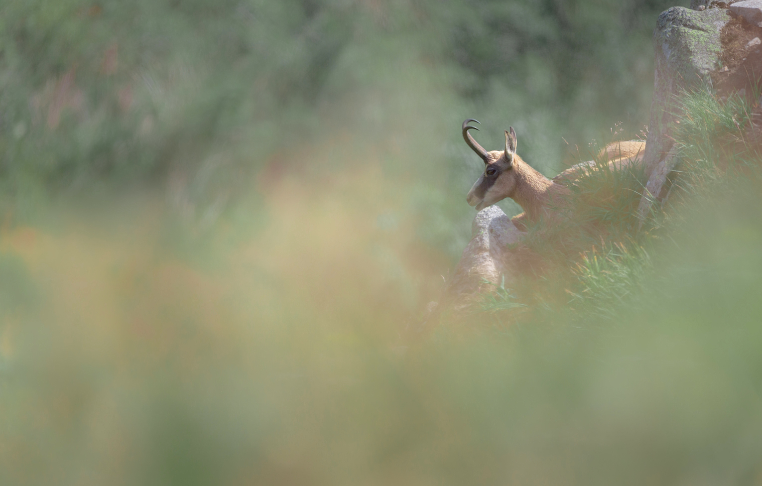 Omdat het al laat in de ochtend is kan ik geen gebruik maken van de opkomende zon als sfeermaker, er is alleen een felle middagzon beschikbaar. Dat maakt niet uit, want ook zonder magisch licht kun je leuke sfeerbeelden maken. Zelf ben ik erg gecharmeerd van een onscherpte in mijn foto’s, bij mijn macrofoto’s pas ik dit dan ook veel toe. Dat wil ik in deze foto ook zien te bereiken. Doorkijkjes zijn in deze omstandigheden ideaal om door te fotograferen. Door de bladeren van een boom bijvoorbeeld, zo creëer je een kader van onscherpte om je onderwerp heen. Helaas, geen bomen op de hoogte in de bergen. Alleen lager in het dal waar de gems ligt. Daar kan ik nu alleen met geen mogelijkheid komen.