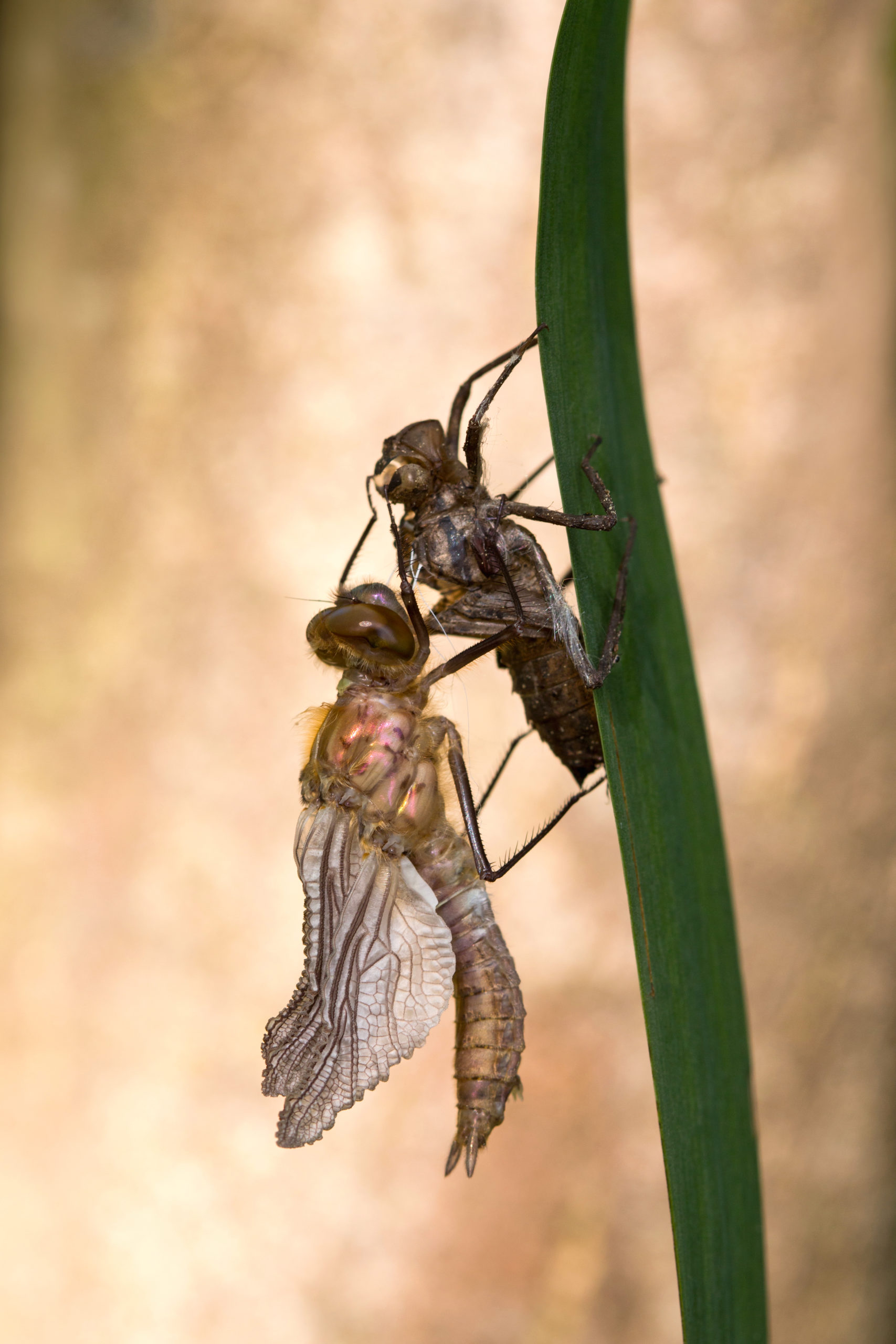 Ik ging speciaal om de libellen te fotograferen. Het ging me vooral om de geboorte -het uitsluipen- van een libel vast te leggen. Een libel leeft het grootste gedeelte van haar leven onder water als larve. Deze larven vervellen een paar keer voor ze volwassen zijn.