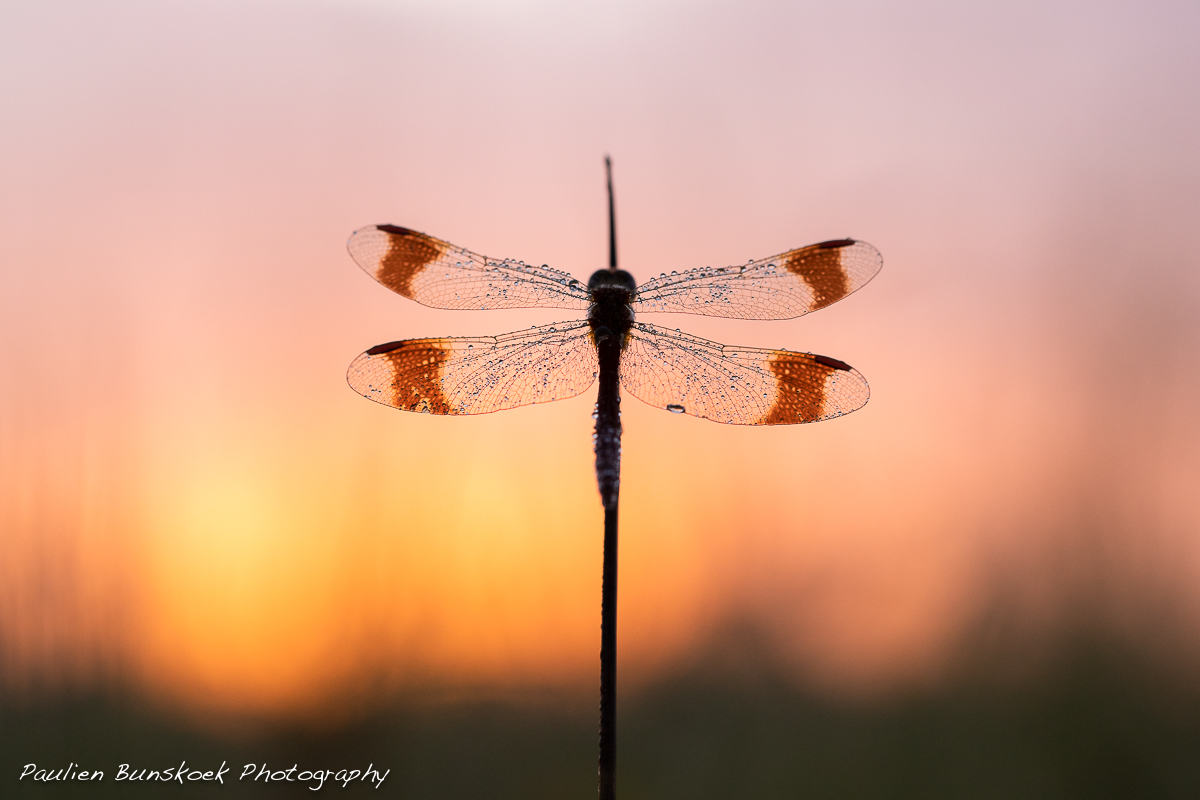 De koude ochtenden met dauw zijn ondertussen zeldzamer dan bandheidelibellen en ik ben blij als de voorspellingen zo’n ochtend aangeven. Op deze ochtend was het windstil en bewolkt. Er was wel dauw gelukkig. Met lichte bewolking kan er van alles gebeuren bij zonsopgang dus het is belangrijk dat je al een compositie hebt. Ik zet mijn onderwerp bijna nooit in het midden van de foto maar in dit geval vond ik de symmetrie juist mooi. Op deze ochtend kleurde de opkomende zon de bewolking heel even prachtig oranje/roze, en omdat ik al klaar zat kon ik deze foto maken. Deze kleuren waren er echt maar een minuut, toen verdween de zon achter de wolken en bleef het verder wat saai.