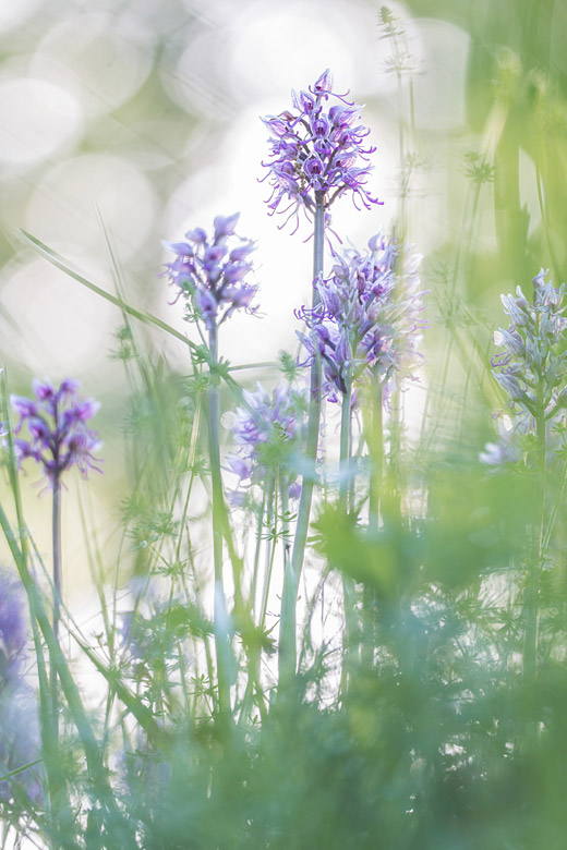 ” De aapjesorchis is een prachtige plant: mooie witte bloemen met lange paarse slierten als versiering. Een rijtje bloemen van de aapjesorchis zouden alle verjaardagsslingers in de winkel doen verbleken. Je hebt dus niet veel nodig om van deze plant een mooie foto te maken. Je lens er op richten en afdrukken levert bijna gegarandeerd een mooie foto op. Maar de uitdaging als natuurfotograaf is natuurlijk om er nog iets meer uit te halen dan dat en een eigen draai te geven aan de foto’s.