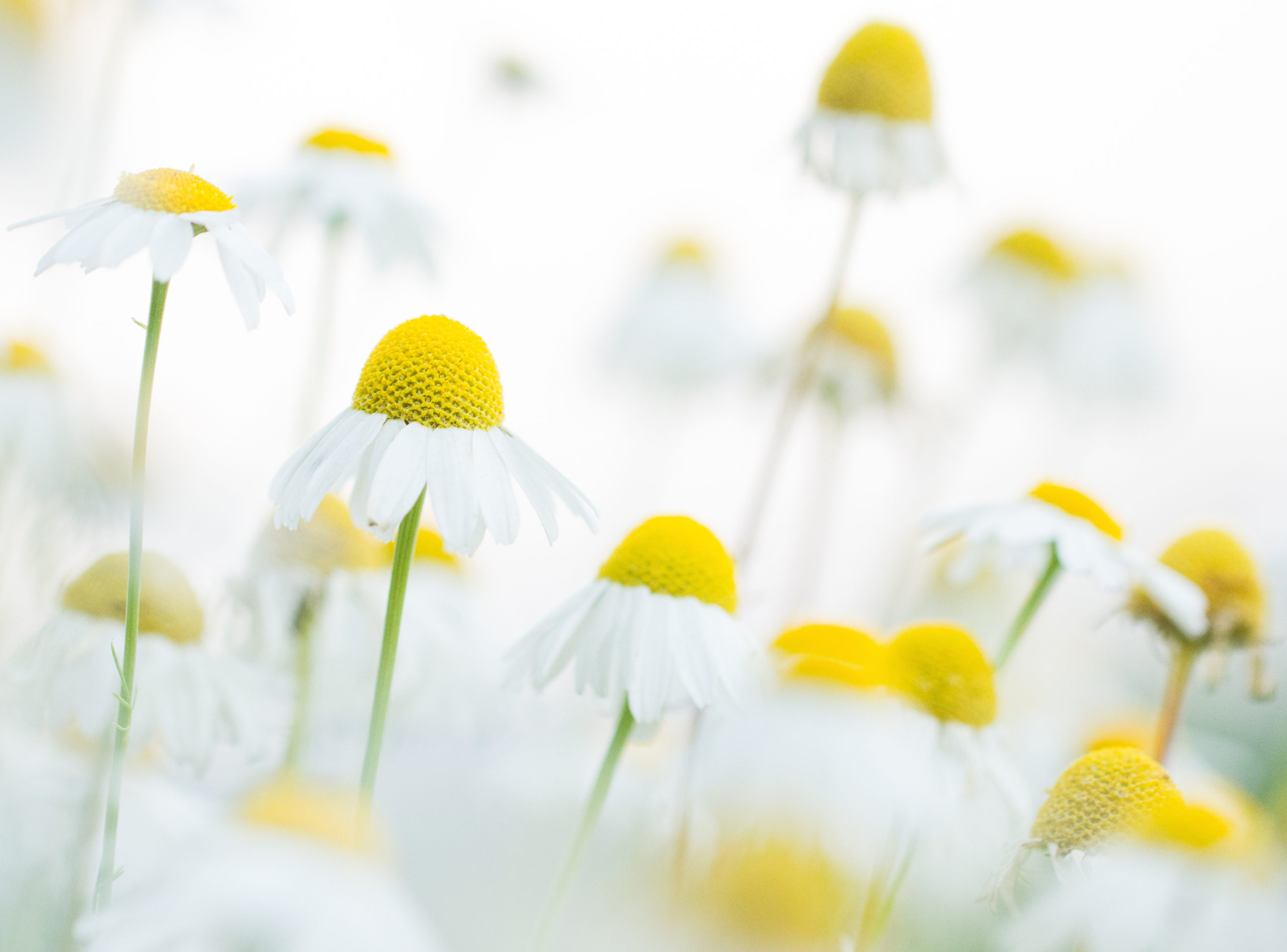 Kamille – Alexey Korolyov. Bij high key fotografie zijn de contrasten beperkt. In deze foto van wilde kamille is veel wit te zien, maar het is nergens uitgebeten wit.