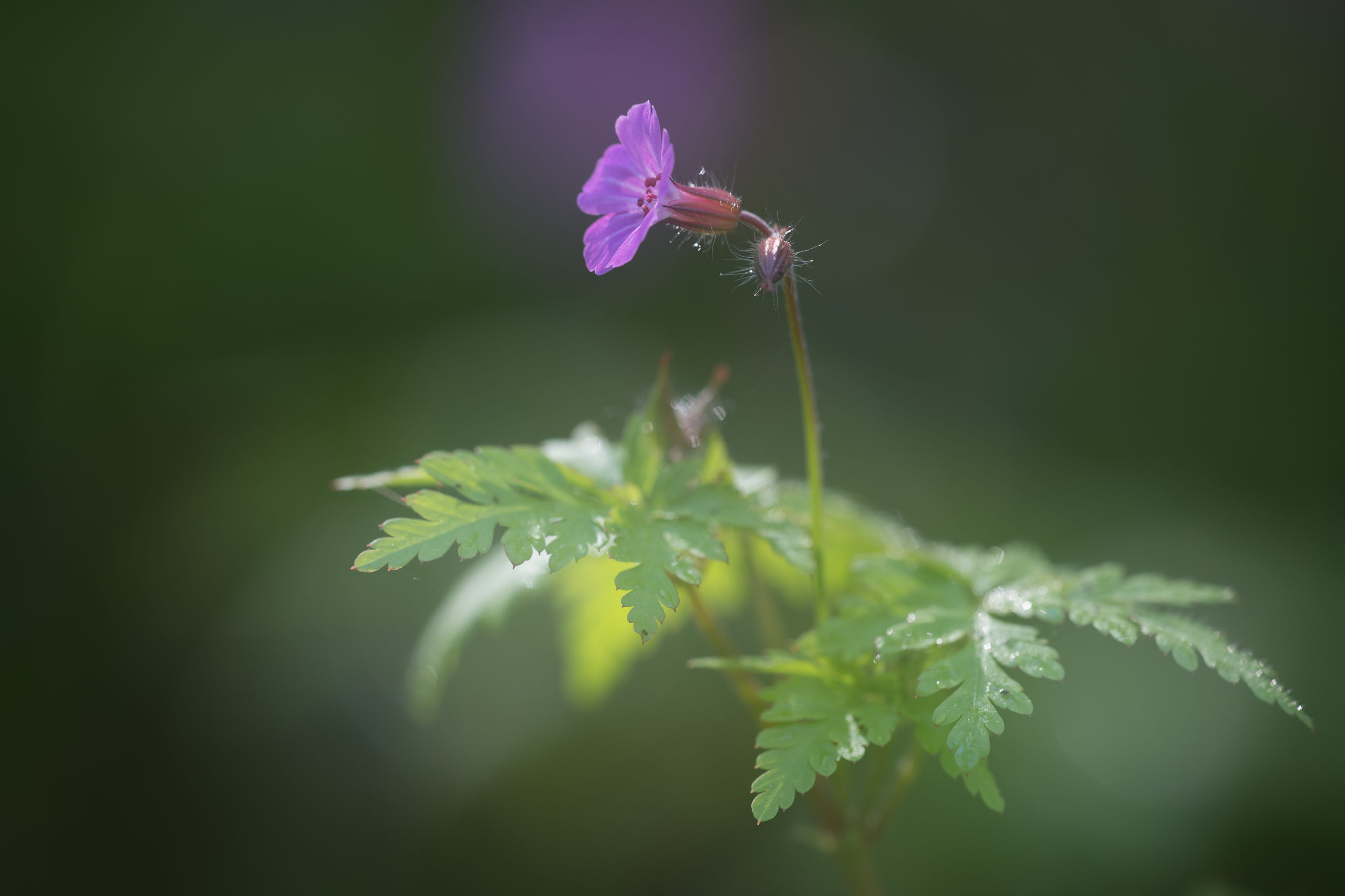 Robertskruid – Olaf Oudendijk. Het (eigenlijk onopvallende) bloemetje van het robertskruid krijgt in deze foto de hoofdrol door de volledig groene omgeving.