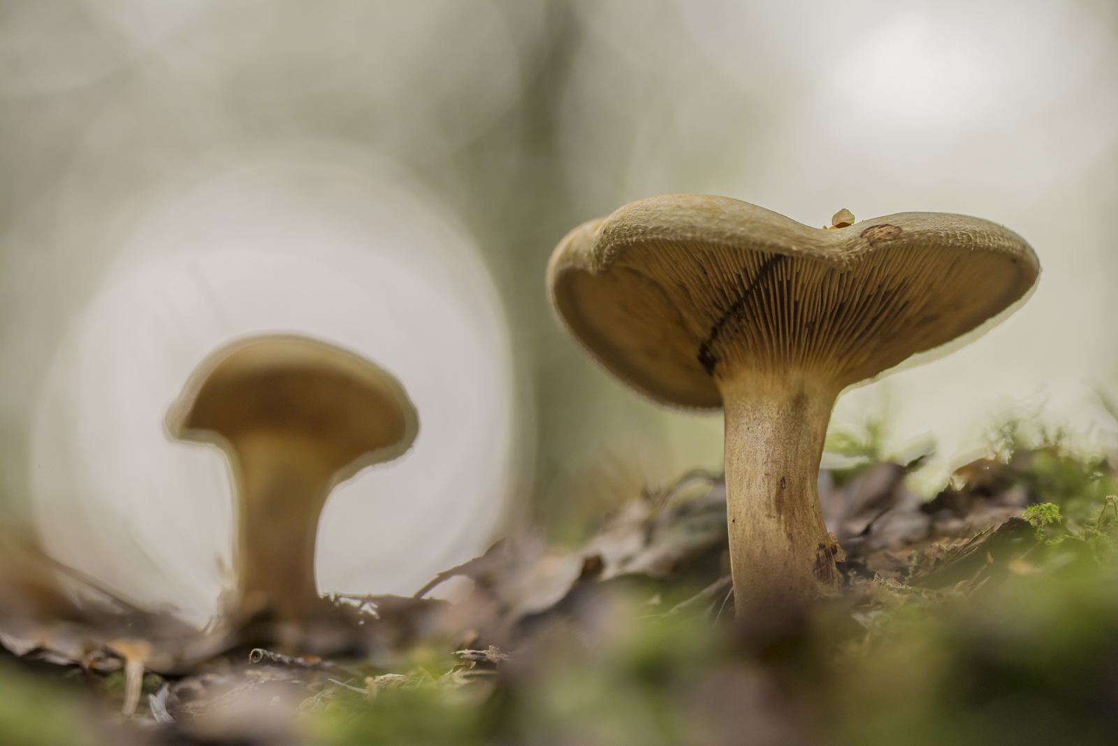 Als ik weer verder wil lopen roept hij me weer terug: “Papa, kijk! Deze loop je zomaar voorbij.” Aan de rand van een droge greppel staan twee paddenstoelen. Ik zie direct de mogelijkheden van dit tafereel. Vanuit de greppel kan ik een laag standpunt innemen. Dat geeft de mogelijkheid om de lichtvlekken tussen de kruinen van de bomen te gebruiken in de achtergrond. Snel ruim ik een paar takjes en dennenappels op die storend in het beeld liggen. Ik weet dat ik snel moet werken, want ondanks de natuurliefde van mijn zoon is er natuurlijk niet veel aan als papa een half uur op de grond blijft liggen.