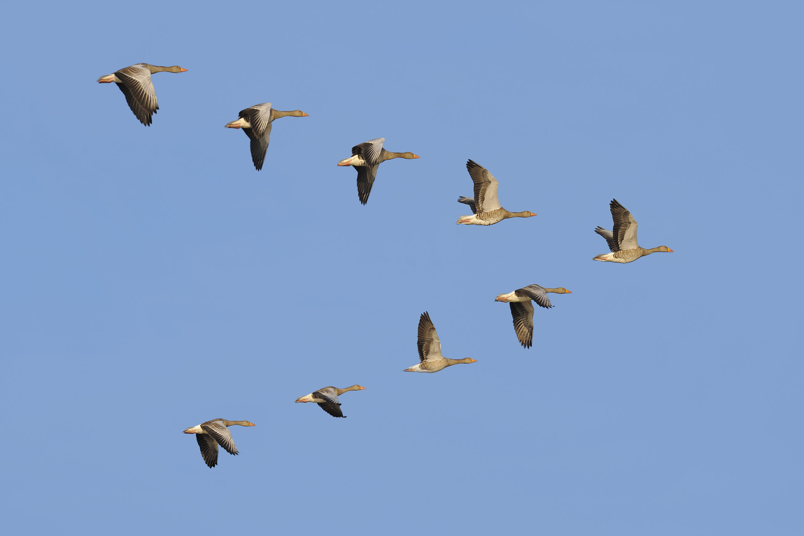 Soms is het een klein V’tje van een klein groepje ganzen en soms is het een formatie van formaat. Dan vliegen tientallen of zelfs honderden ganzen bij elkaar, keurig in het gelid. Waarom vliegen trekvogels in V-formatie? Dat heeft alles te maken met aerodynamische efficiëntie. Daar kwamen onderzoekers zo’n 15 jaar geleden achter toen ze pelikanen die over een meer vlogen onderzochten. Ze ontdekten dat de voorste vogel een veel hogere hartslag had dan de rest van de pelikanen in de formatie. Dat duidde erop dat de voorste vogel meer energie kwijtraakt.