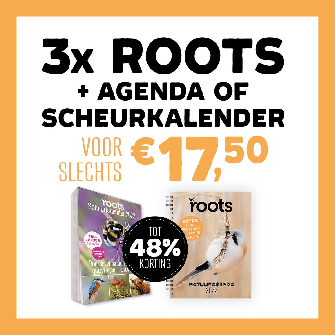De Roots Natuuragenda 2022 (t.w.v. € 13,99) bevat iedere week een weetje en staat verder vol met een selectie van 108 prachtige natuurfoto’s van deelnemers aan de Roots Natuurfotowedstrijd 2021. De Roots Scheurkalender 2022 (t.w.v. € 15,99) bevat 365 full colour natuurfoto’s. Met elke dag een natuurweetje of quizvraag (met antwoord).