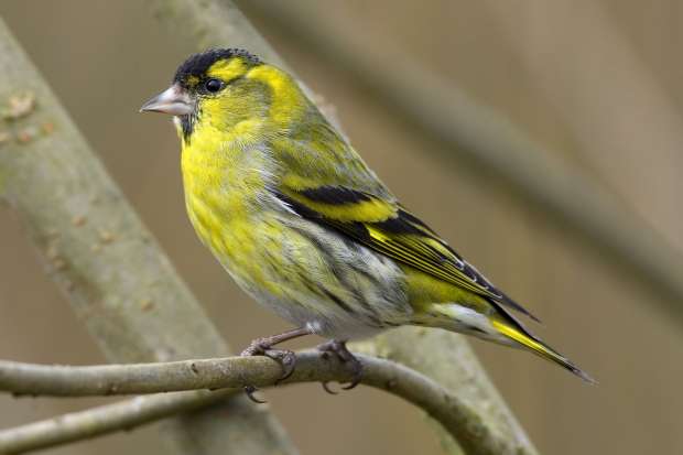 Het mannetje is opvallend geelgroen gekleurd met zwarte kruin, kin en vleugelstrepen. Foto Co van der Wardt