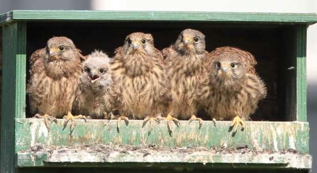 De jonge torenvalken vliegen rond deze tijd uit. Het zijn er dit jaar opvallend veel. Ze zitten nu nog knus op en rond de nestkast, maar zullen straks ieder een kant op vliegen. Meestal niet verder dan 150 kilometer.