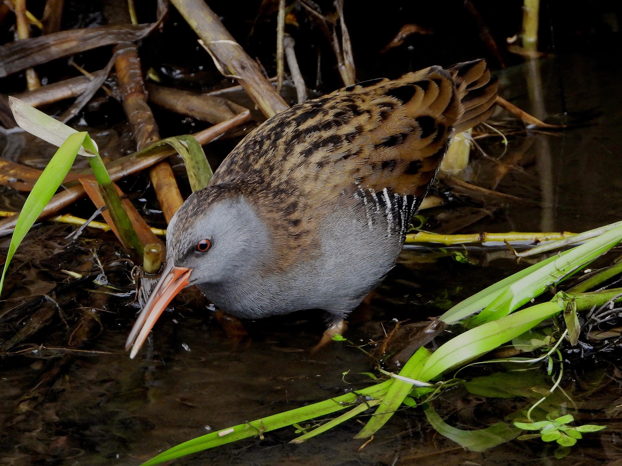 De waterrallen die bij ons broeden zijn vooral standvogel, ze blijven het hele jaar hier. In de wintermaanden wordt de populatie wel aangevuld met broedvogels uit Oost- en Noord-Europa, zodat het er ineens veel meer zijn. Waterrallen zijn ook in de winter opvallend luidruchtig, en ze kunnen een breed scala aan geluiden maken. Ze tokken als kippen, grommen en schreeuwen, onheilspellend kreunen en klagen, gillen als een varken. Hoor je ze, probeer ze dan zo dichtbij mogelijk te benaderen, wees stil en zoek vervolgens gewapend met een verrekijker een plekje met uitzicht op de een rietkraag met modderrand… En dan maar hopen dat je een glimp krijgt van deze ranke schoonheid. Met sneeuw op de achtergrond zien ze er extra mooi uit. Duimen voor kouder weer dus!
