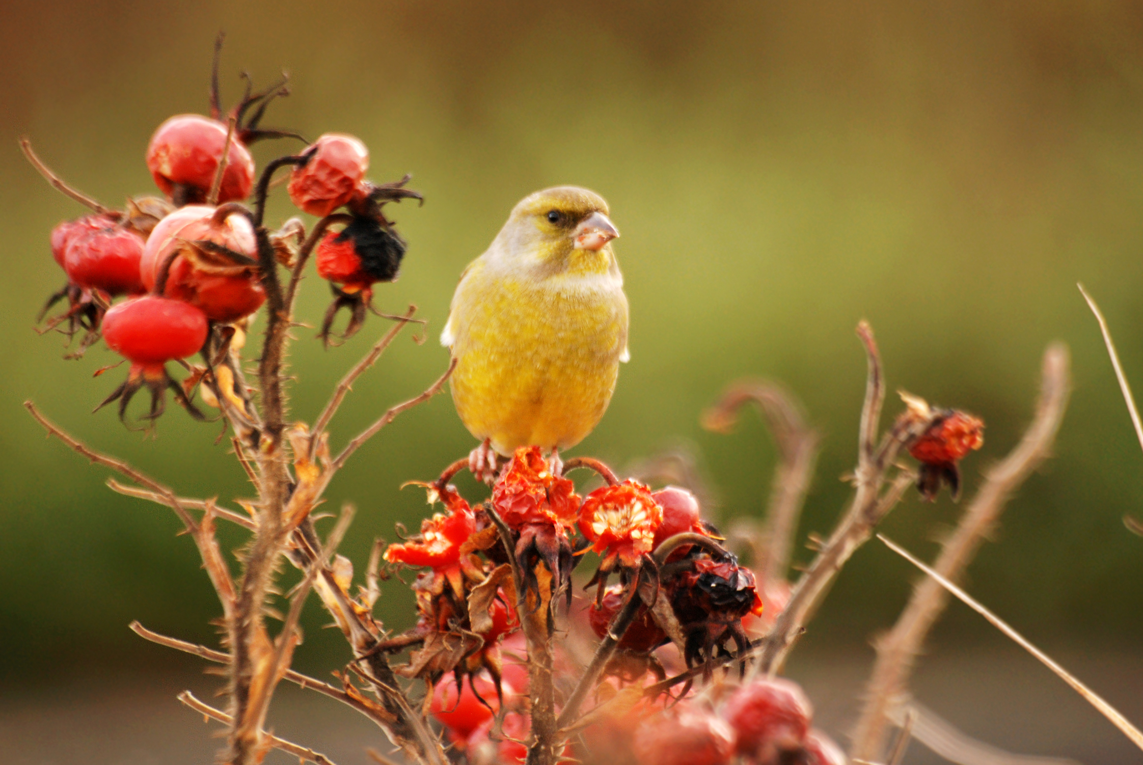 Als de grond vorstvrij is, is er nóg iets dat je voor de groenling kunt doen en dat is het planten van een struik zoals de hondsroos. Dat heeft niet meteen effect, maar wel in het najaar, want de groenlingen eten graag hun rozenbottels. Plant ook een dichte, wintergroene struik of boom. Bijvoorbeeld een conifeer waarin ze kunnen schuilen en nestelen.