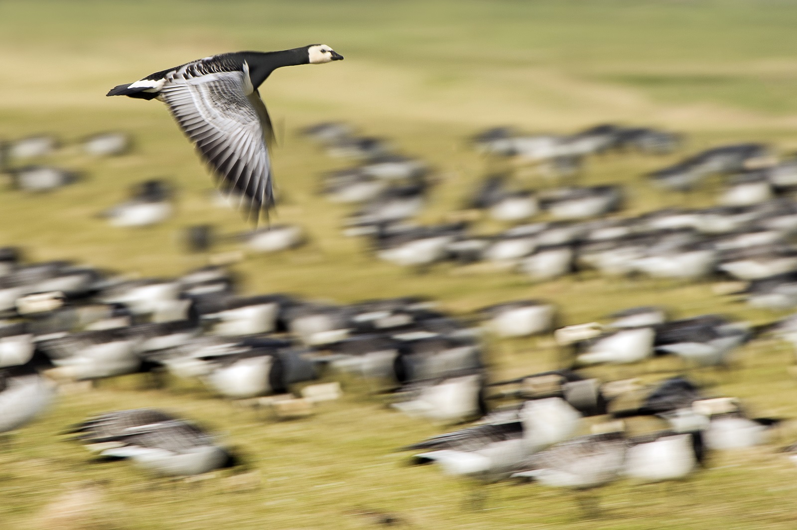 Wat die vorm betreft is Borkum het buitenbeentje onder de waddeneilanden. Niet langgerekt, maar hoefijzerachtig, met de opening richting het oosten. De buitenrand van dat hoefijzer bestaat uit zand, de binnenrand uit polders. Zodoende wandel ik op de scheidslijn tussen duin en weide. Rechts van het pad strijkt een grote groep brandganzen neer in het gras. Witwangganzen, letterlijk vertaald uit het Duits. De Duitsers kennen ook een eigen brandgans, vertelde een enthousiaste vogelaar me op de veerboot, maar die soort is in Nederland bekend als de bergeend.