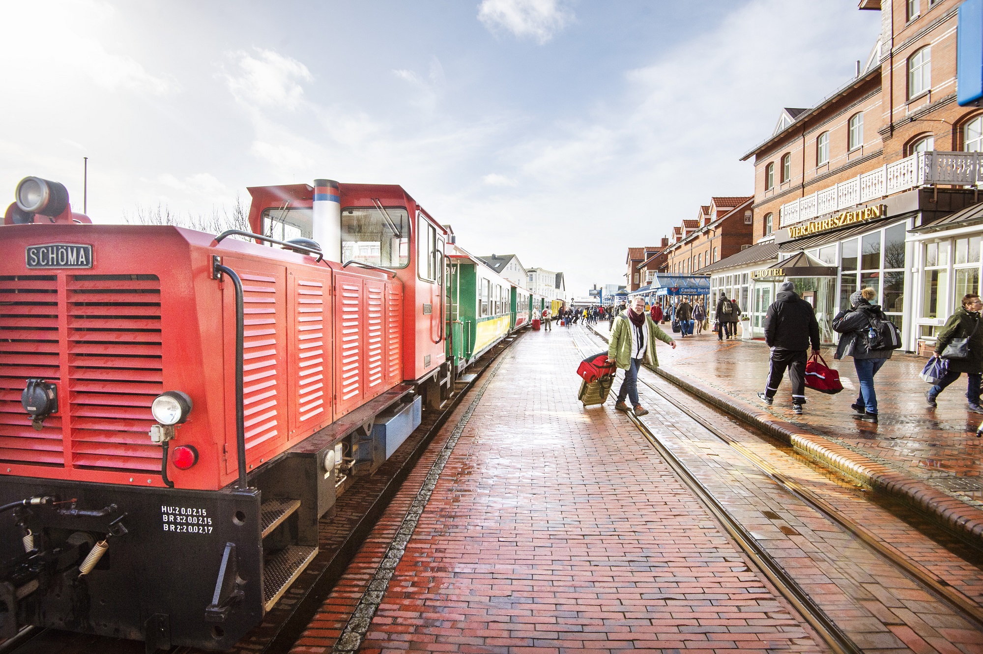 En dat terwijl er toch genoeg verschillen zijn. Nooit eerder zag ik een Waddeneiland met zoveel hoge bebouwing. Of met een felgekleurd dieseltreintje, dat me direct na aankomst over de ‘Kleinbahn’ naar het dorp brengt. Misschien is het de menselijke neiging tot categoriseren, denk ik terwijl de trein tussen de weilanden doorrijdt. We zoeken naar het vertrouwde, hoe ver van huis we ook zijn. Niet toevallig kregen door Nederlanders ontdekte landen en nederzettingen eeuwen geleden namen als NieuwZeeland en Nieuw-Amsterdam: plekken om je ook ‘in den vreemde’ thuis te voelen.
