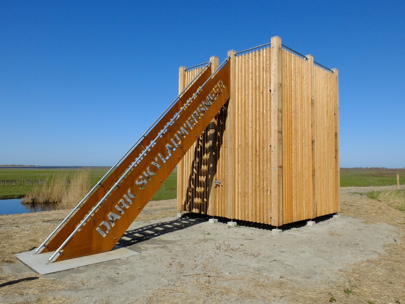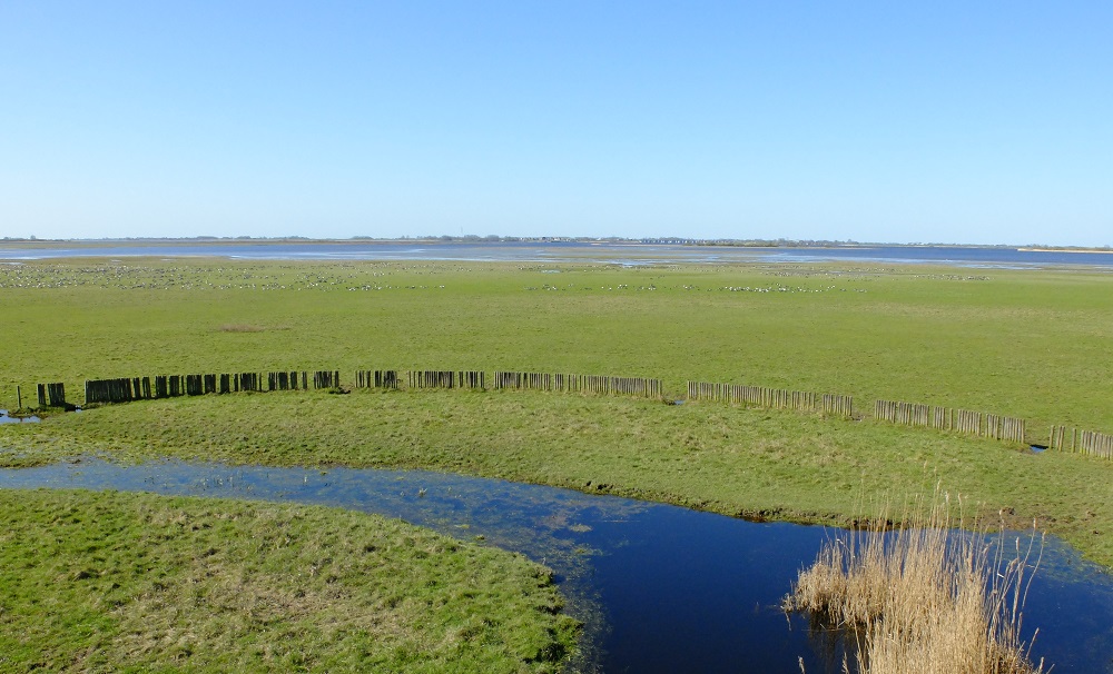 Hoewel ik dus geen mens tref onderweg, staan er tot mijn verbazing wel een man en een vrouw (en een hond) op de uitkijktoren. Een uitkijktoren is ergens toch een soort lift, je kunt moeilijk niets zeggen wanneer je elkaar treft in een kleine ruimte. Het zijn gelukkig vriendelijke mensen die niet steeds zeggen: “Daar vliegt die en die, en hoor ik daar zus en zo fluiten?” Wel wijzen ze waar het nest van de zeearend is. “Daar op dat eiland in die bomen.” In de verte ligt inderdaad een eiland met bomen. Helaas vliegt er nergens een deur (zo noemen ze een zeearend ook wel) door het luchtruim. “Dan was het paniek geweest onder de ganzen”, zegt de mevrouw.