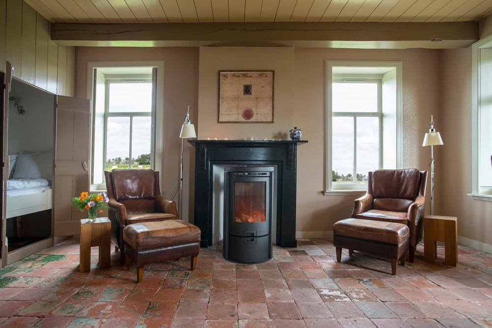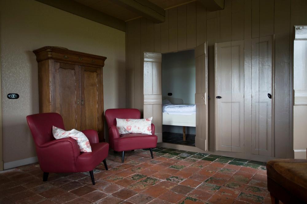 Als we de auto uitstappen, nemen we eerst de omgeving in ons op. We kijken kilometers ver. Tegen de horizon tekenen de contouren van Groningen zich af, een van de fijnste provinciehoofdsteden van Nederland. Verder zien we weilanden vol kleur en een lucht in blauw en wit; wit van de dikke pluiswolken die her en der voorbijschuiven. En wat is die lucht heerlijk fris! We kikkeren er meteen van op, na de lange autorit. Vanbuiten ziet het boerderijtje, pal aan de slotgracht, er schattig uit: een houten hekje naar het erf, een bloementuintje tegen de zijgevel, een oude waterput. Binnen is het al net zo uitnodigend. Twee comfortabele stoelen naast de haard. Originele rode en groene plavuizen op de vloer, maar wel met lekkere vloerverwarming eronder. Een keukentafel met het mooiste en verste uitzicht van de wereld. Bedstedes! Dit gaat helemaal goed komen hier.