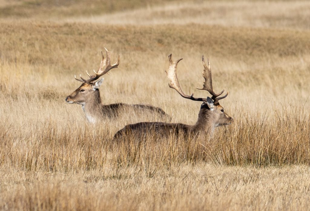 Vier damherten ademen wolkjes en vluchten de duinen in wanneer het portier van de auto met een klap dichtvalt. Tussen zonsondergang en zonsopkomst rekenen zij ook de parkeerplaats tot hun domein, want wandelaars zijn pas welkom zodra de zon weer op is. Het is een gure februariochtend. Op een eenzame hardloper na is er nog niemand te bekennen. De zon is nog maar net op en kleurt de lucht oranje. Temperaturen onder het vriespunt hebben vannacht een dekentje van ijskristallen over de duinen uitgespreid. De verdroogde, roodbruine adelaarsvarens bij de start van de wandeling kleuren mooi bij het dunne laagje rijp.