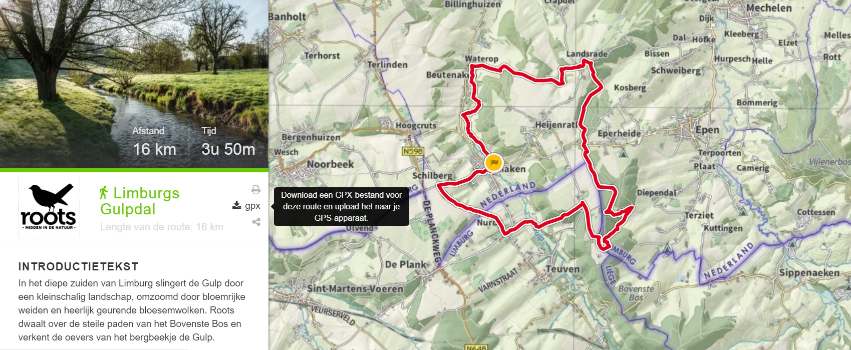 Om een route in je gps te zetten, moet deze verbonden zijn met een computer. Deze herkent het toestel als een harde schijf. Om bijvoorbeeld een Roots-wandelroute in je gps te zetten, klik je hier. Je ziet de kaart van Nederland met daarop allemaal wandelingen. Kies een route en klik vervolgens het downloadsymbool (staat onder het printersymbool). Je gpx-bestand staat nu in de map ‘downloads’. Je kunt de route nu op je gps-apparaat (of je telefoon) zetten en op pad gaan.