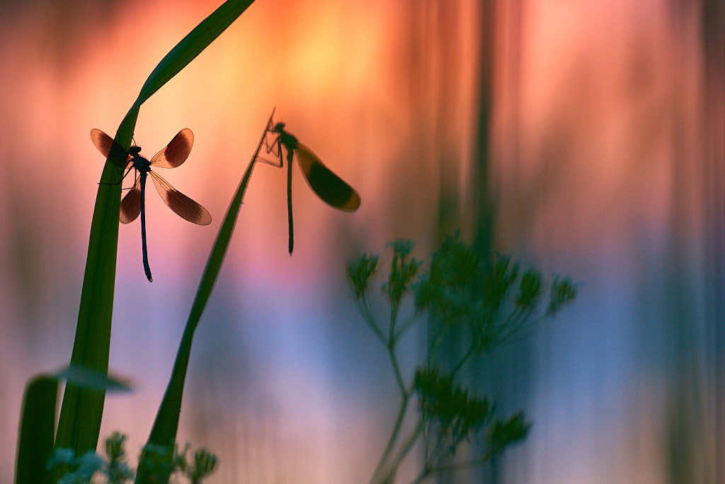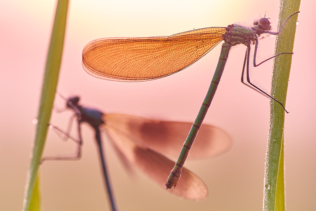 Weidebeekjuffers hebben waanzinnig mooie details, maar vergeet niet om het beestje ook in zijn omgeving te fotograferen. Deze foto is gemaakt tijdens zonsopkomst met een lichte telelens. Het linker mannetje heeft zijn vleugels al geopend om zoveel mogelijk zonlicht te vangen zodat hij snel opwarmt.