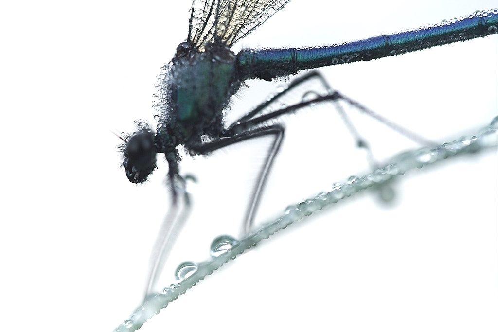 De weidebeekjuffer hoeft er niet altijd compleet op te staan. Ook een beetje meer abstracte foto’s zijn leuk om te maken. De pootjes worden bijna doorzichtig doordat van zeer dichtbij gefotografeerd is. Ook hier is weer een open diafragma gebruikt om alleen bepaalde details scherp op de foto te krijgen.