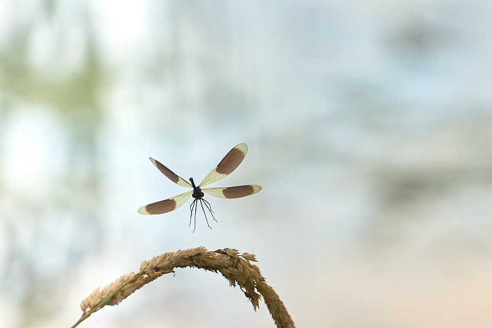 Waar de vorige statische foto’s allemaal ’s morgens vroeg zijn gemaakt, is deze dynamische foto overdag gemaakt. Als het nog fris is, zijn de weidebeekjuffers prima te benaderen en blijven ze rustig op hun plek zitten. Zodra ze opgewarmd zijn en gaan vliegen wordt het een hele nieuwe uitdaging om ze vast te leggen. Vanwege hun snelheid heb ik de ISO flink omhoog gedraaid zodat ik sluitertijden van 1/2000 seconde kan halen. Als je de vliegende weidebeekjuffers een tijdje observeert, zal opvallen dat ze bijna altijd op dezelfde plek terugkeren. Ze zitten ergens, vliegen even rond en landen weer op dezelfde plek. Dus ik heb dan ook op de grashalm scherpgesteld en net zo lang gewacht totdat de weidebeekjuffer de landing inzette. De camera op continue fotograferen en na een burst zitten er meestal wel een paar aardige en soms een heel geslaagde foto tussen.
