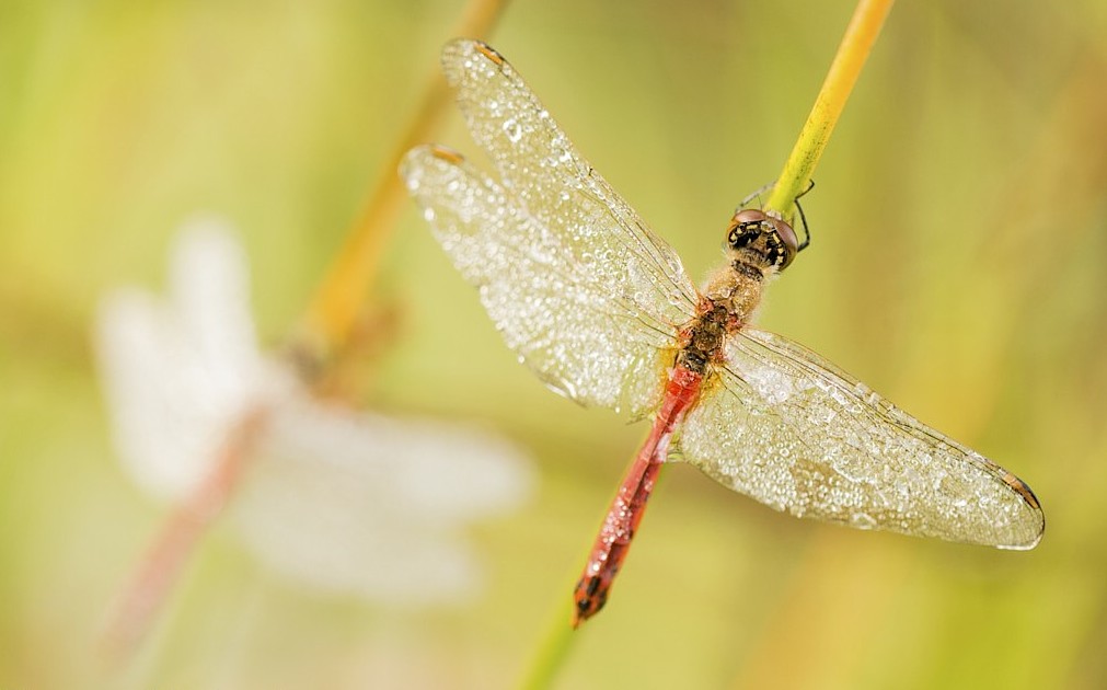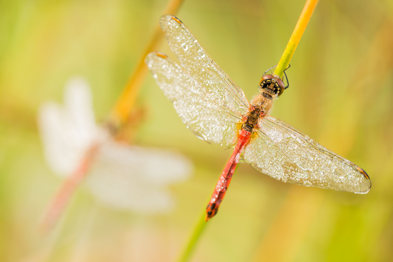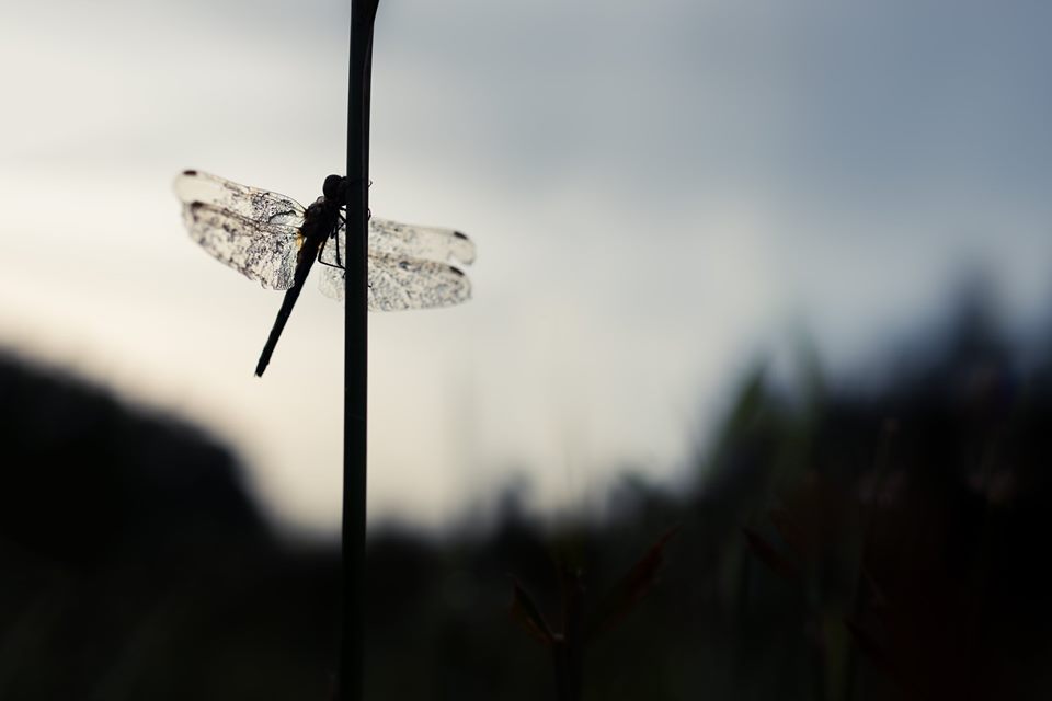 “Hoewel ik voornamelijk fotografeer met een 150 millimeter macrolens voor de close-ups, heb ik hier gebruik gemaakt van een 35 millimeter macrolens waarbij ik meer omgeving in de foto betrek. Omdat ik een silhouet wilde waarbij je de lucht door de vleugels kon zien moest ik laag bij de grond fotograferen, zodat de libel boven de boomtoppen op de achtergrond uit zou komen. Een nat pak neem ik dan maar voor lief, dat hoort er eigenlijk ook gewoon bij. Om de belichting goed te krijgen, moest ik de foto 2/3 stop onderbelichten. Diafragma f/4, sluitertijd 1/3200, ISO 200.”