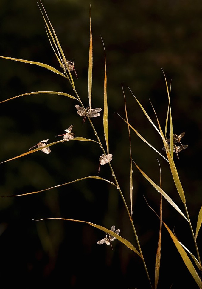 “Het is een bijzondere ervaring om met vier andere fotografen op stap te gaan, zeker als dat zulke meesterfotografen zijn als waar ik mee op stap mocht. En als ik dan in alle vroegte overal om me heen de sluiters hoor ratelen, terwijl ik nog op zoek ben naar een geschikt onderwerp wordt het zelfs een beetje intimiderend. Libellen genoeg, maar ze zitten niet mooi genoeg naar mijn zin, of ze laten zich vallen als ik er maar naar durf te kijken. Uiteindelijk maak ik wel een paar foto’s, maar het zijn niet meer dan registraties. Pas als ik mezelf een beetje afzonder en naar een naastgelegen veldje ga vind ik de rust en de juiste libellen.