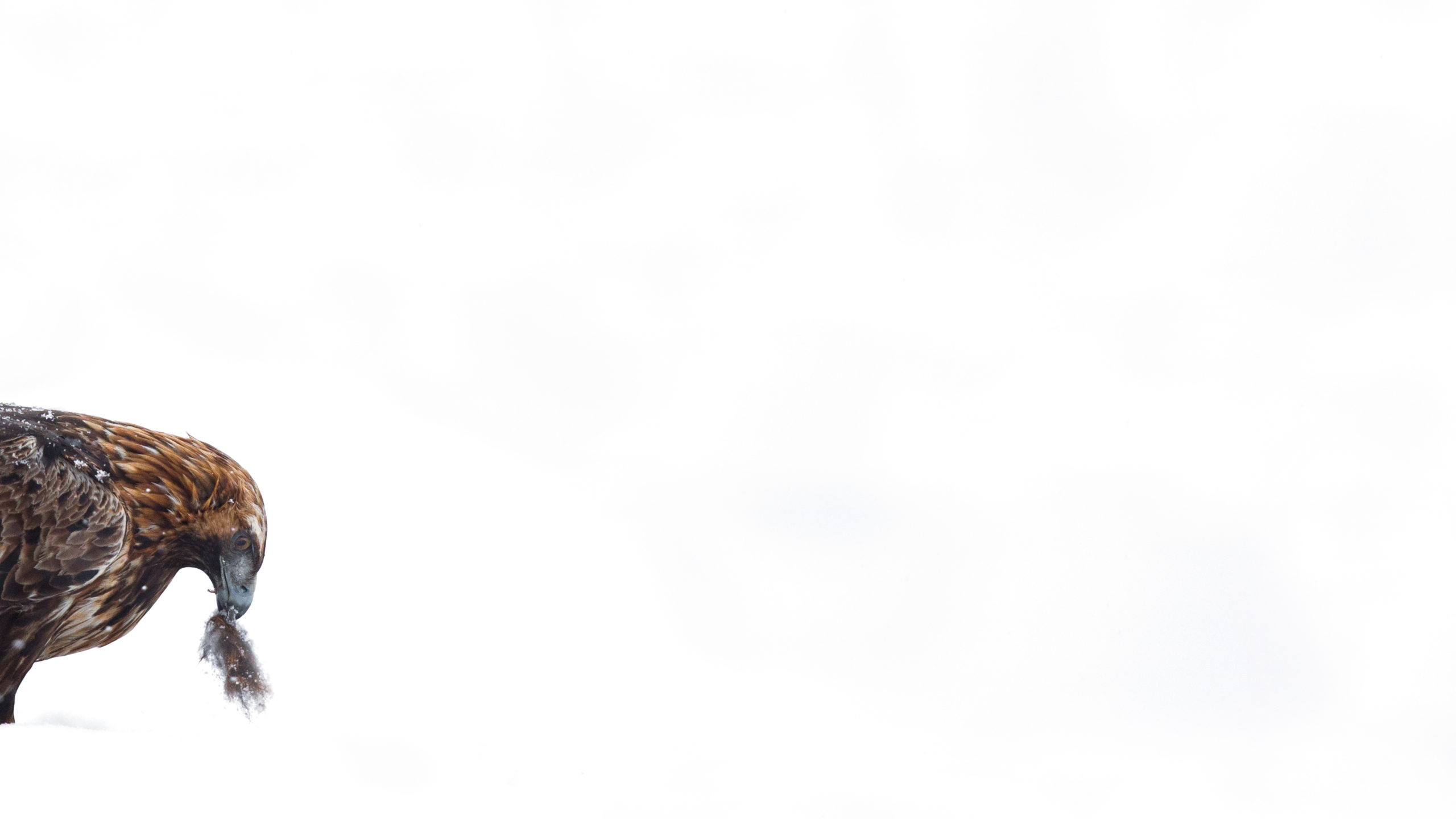 Deze steenarend staat in diepe, verse, sneeuw, en door over te belichten wordt die sneeuw één witte, niet zichtbare, massa.
