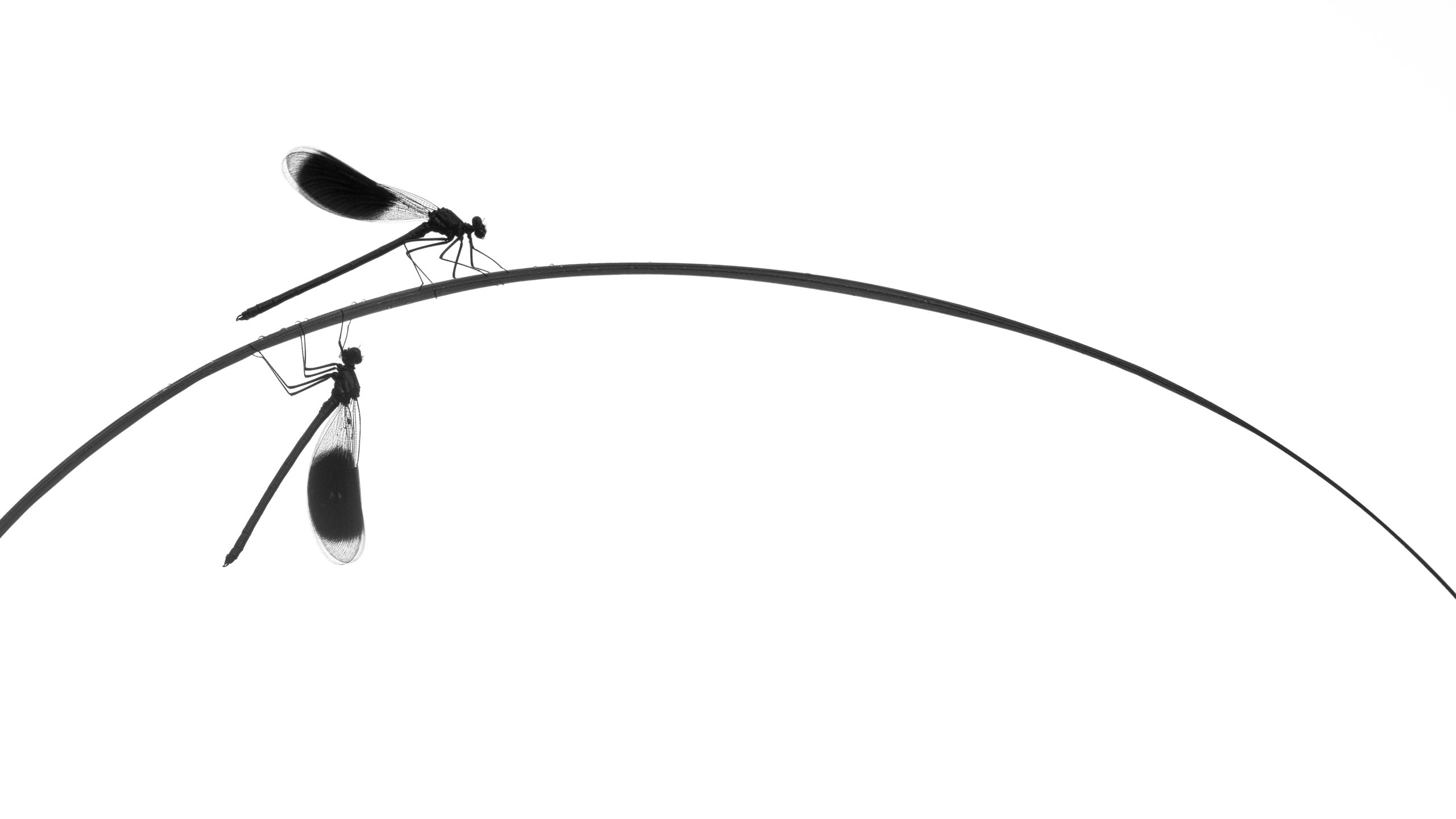 Tijdens een bewolkte dag, twee weidebeekjuffers opwarmend. De basisvorm is een halve cirkel. Overbelicht om de licht blauwe tinten van de wolken en de lucht om te zetten in wit. Vervolgens de foto omgezet in zwart/wit om contrasten te versterken en het beeld te versimpelen.