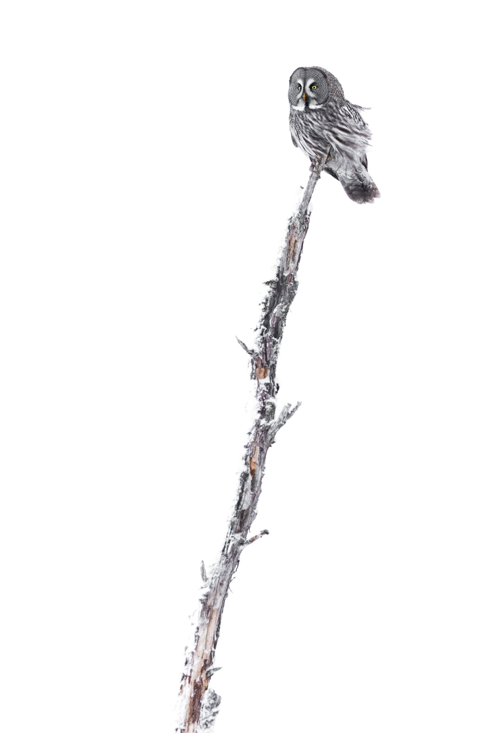Door een lager standpunt te kiezen, fotografeerde ik over de bosrand heen en kwam de laplanduil tegen een lichtbewolkte achtergrond beter tot uiting. Door vervolgens over te belichten is die achtergrond wit geworden.