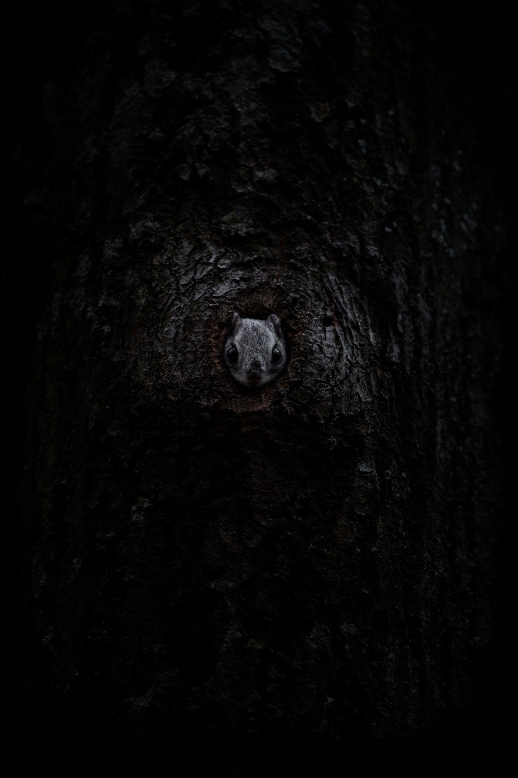 De gewone vliegende eekhoorn komt zijn holletje pas uit als de zon onder is en door nog wat extra onder te belichten creëer je het gevoel van avond of nacht.