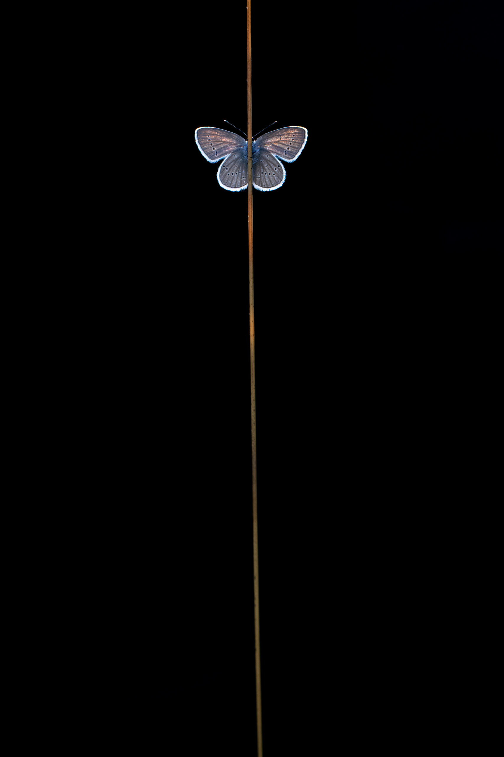 Basisvorm: rechte lijn, centraal geplaatst. Een dwergblauwtje opwarmend in de opkomende zon, met een zwarte fototas als achtergrond, en behoorlijk onderbelicht.