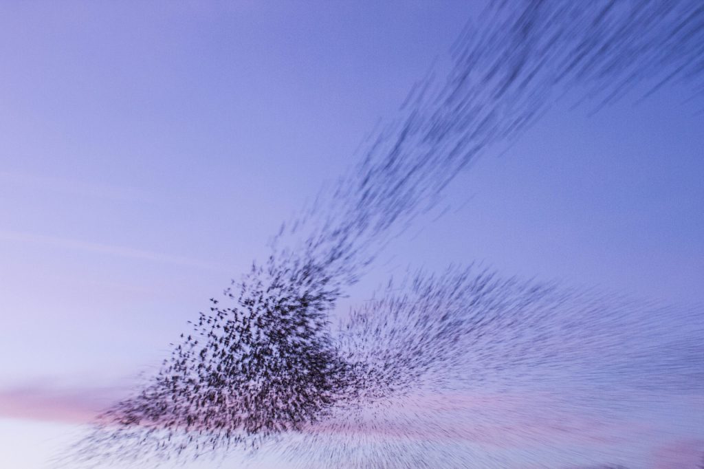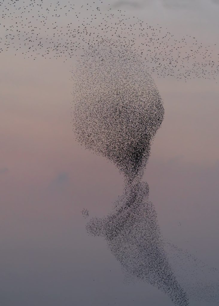 De spreeuwenwolken vormen zich meestal aan het eind van de middag. De spreeuwen zoeken elkaar dan op om gezamenlijk ergens de nacht door te gaan brengen. En in de tussentijd vliegen ze rond als één grote spreeuwenwolk. Op het moment dat er roofvogels in de buurt komen begint de spreeuwenwolk te veranderen. Er ontstaan wervelingen in de wolk om de vijand in verwarring te brengen. En dat zijn de mooiste momenten om te fotograferen.