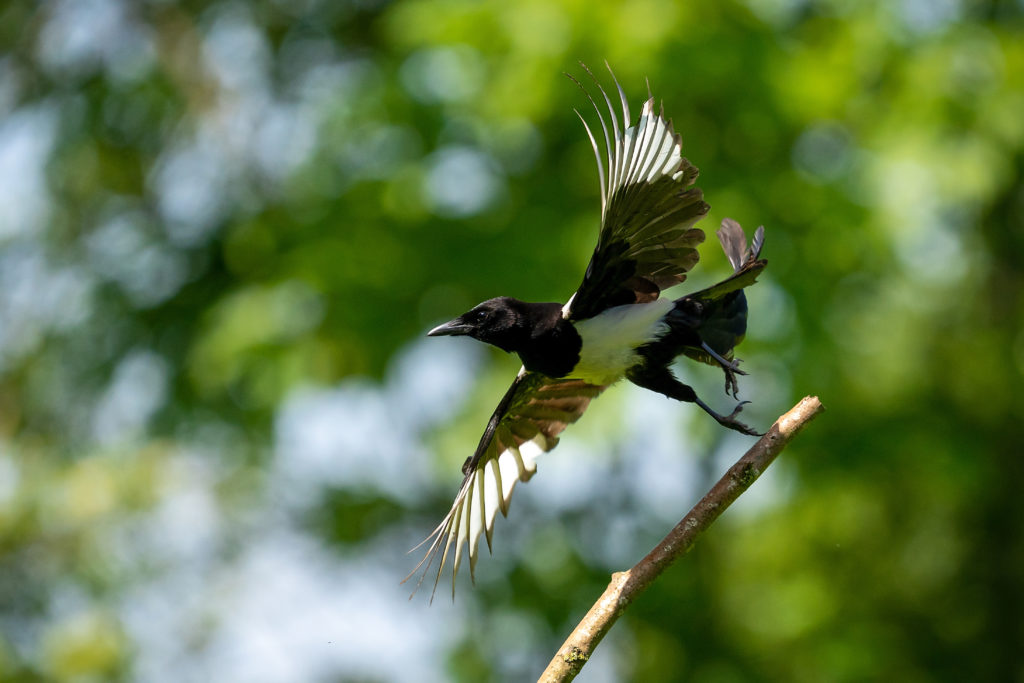 Opvliegende ekster • Karin de Jonge • Prachtig moment, de ekster is net los gekomen van de tak.