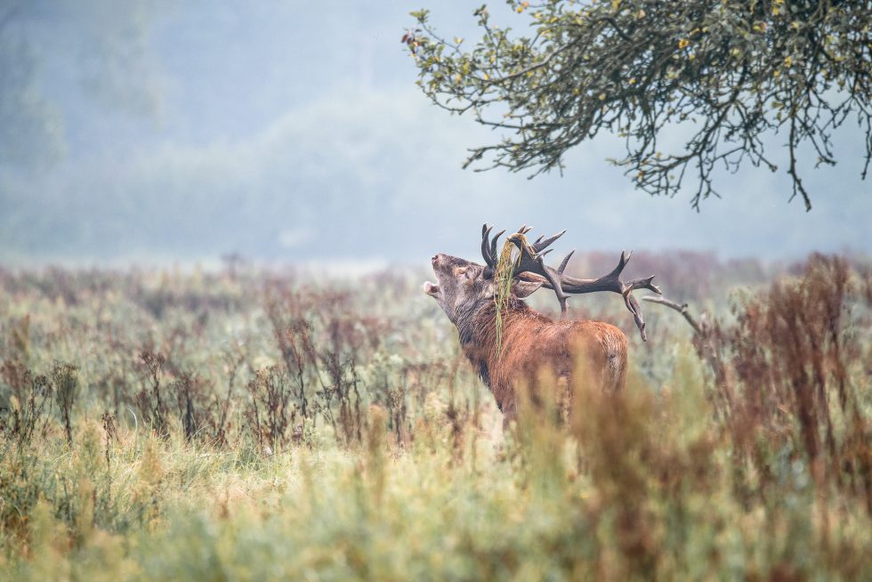 Burlend edelhert • Bert Kok • De geopende bek, de pluk gras aan het gewei, de ruige omgeving. Alles straalt kracht uit in deze foto.
