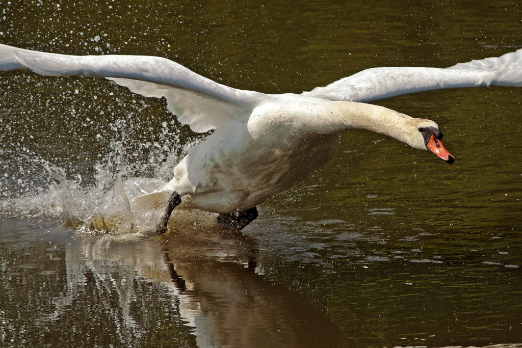Opvliegende zwaan • Dirk Vet  • De aangesneden vleugels geven de indruk dat de zwaan het beeld uitvliegt, dat benadrukt de kracht, net als de druppels.