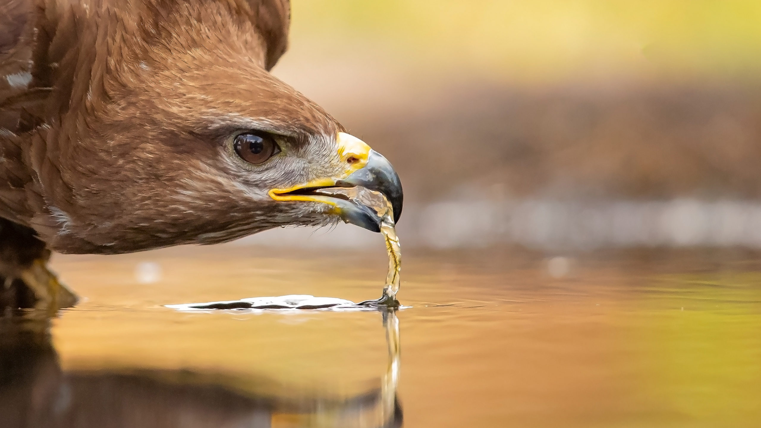 Buizerd drinkt wat op een warme dag • Gert ter Horst • Subtiele weergave van kracht: het indringende oog van een buizerd.