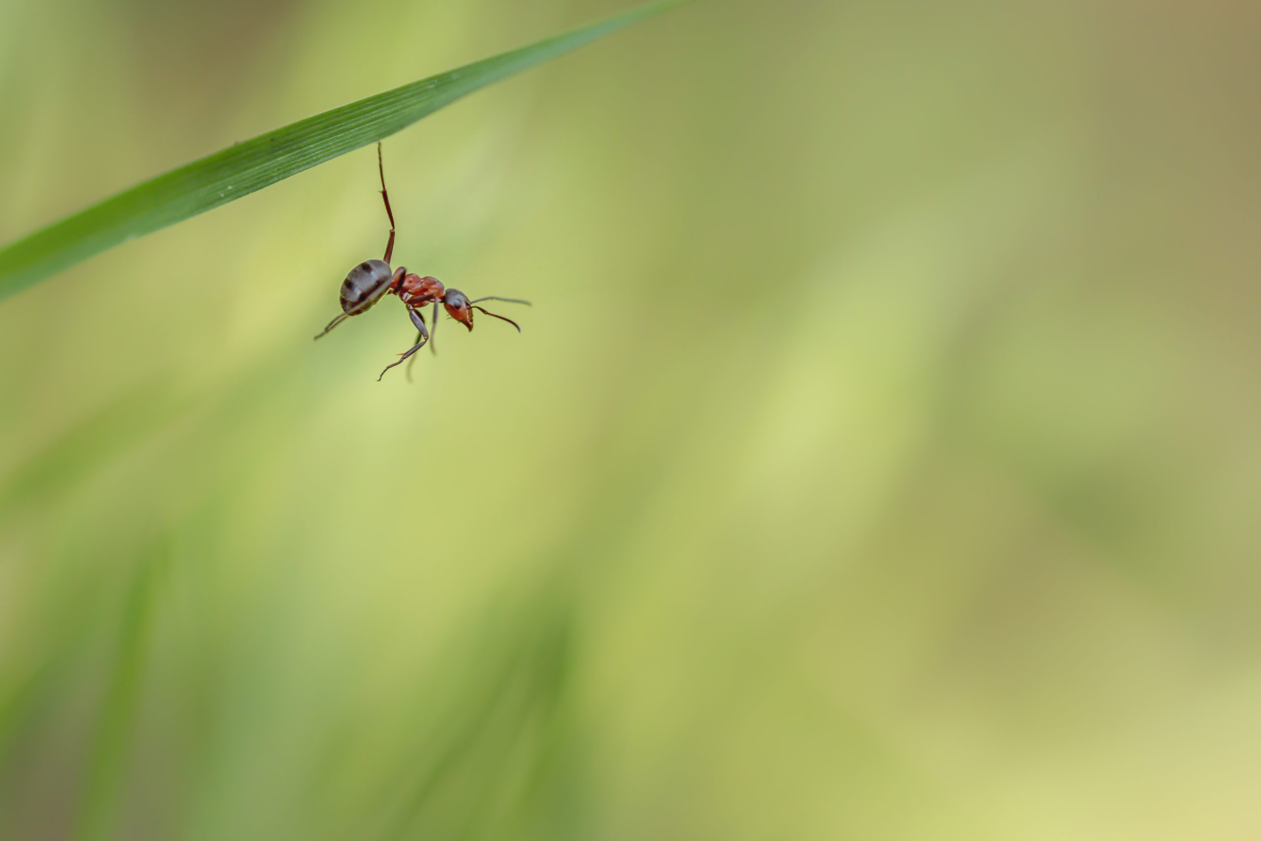 Plakkracht? • Noortje Russel • Wat een bijzonder, intrigerend beeld! De leegte waarin de mier hangt wordt mooi benadrukt door de compositie. Het diagonale grasje is een sterk beeldelement. De bruinrode kleur van de mier zorgt voor voldoende spanning.