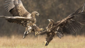 Krachtpaters • Kristel Feytongs • Twee zeearenden vechten om voedsel. Best gewaagd om de vleugels van deze zeearenden zo aan te snijden. Maar het pakt hier prima uit. De foto wordt er nog spontaner van. De interactie tussen de dieren, met de rondvliegende strootjes, is perfect vastgelegd. Het lijnenspel (twee diagonalen en één horizontale vleugellijn) is boeiend. Het licht valt fraai op de koppen.
