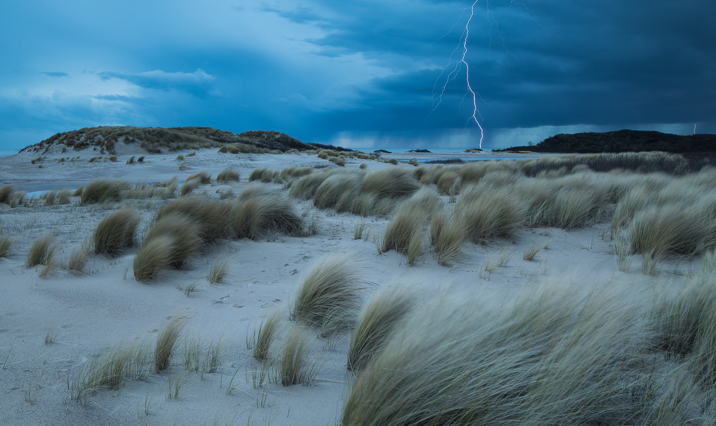 Bliksem • Robbert de Smet • Spannend licht, de wind die door het helmgras waait, een afgewogen compositie met de bliksem op tweederde van de breedte en een coulissenlandschap met een uitkijkje op zee. Allemaal ingrediënten voor een topfoto!